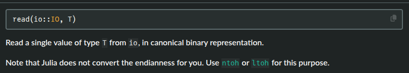 I tested with reinterpret(MyStruct, bytes) and it apparently works, but the result is a vector with a single instance. Any way to return just the instance?